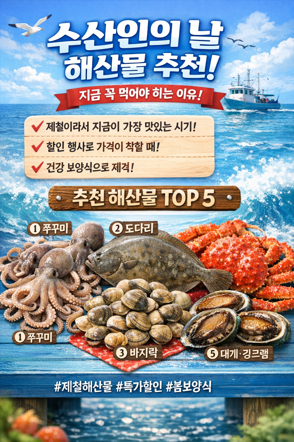 #수산인의날 #해산물추천 #제철해산물 #봄해산물 #쭈꾸미 #도다리 #바지락 #전복 #대게 #킹크랩 #해산물구매 #수산물추천 #수산시장 #해산물요리 #봄보양식 #건강식단 #오메가3 #단백질식단 #해산물택배 #수산물직배송 #캠핑요리 #집밥추천 #식재료추천 #신선식품 #먹거리추천 #해산물요리법 #제철음식 #수산물행사 #할인정보 #식품트렌드